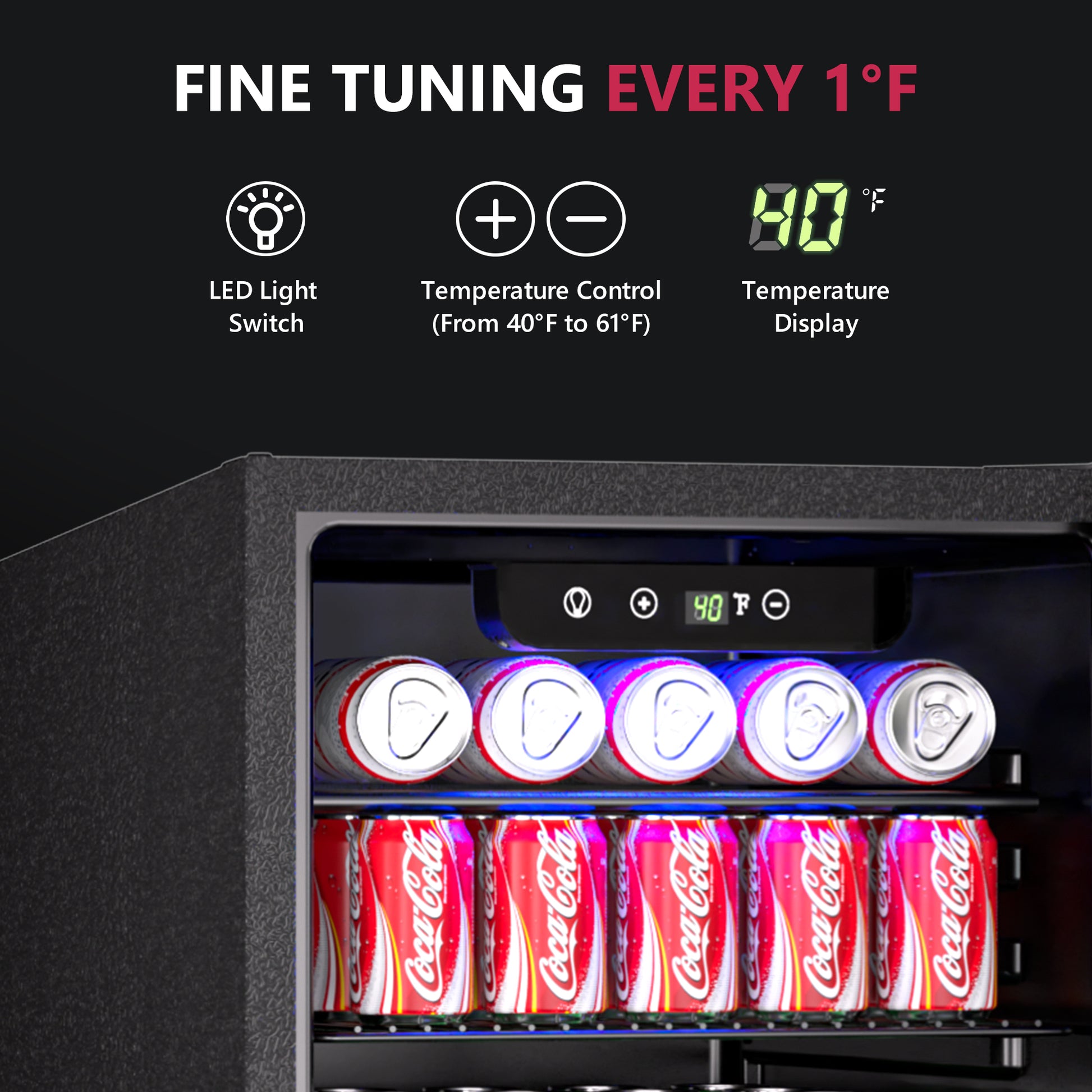 Smart Touch & Temperature Control: Our beverage cooler includes an easy-to-use touch panel for effortless temperature adjustments. Customize your settings from 40°F to 61°F to suit your preferences. With a simple touch, LED lights beautifully illuminate your drinks, adding a touch of elegance to your beer and wine chiller.